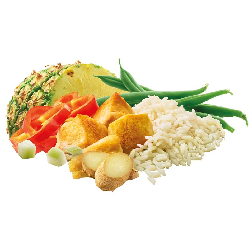 rijst (56%), melkpoeder, 6% ananas gezoet (suiker, ananas, voedingszuur (citroenzuur), conserveermiddel (E223)), 6% kip (kippenvlees, aardappelpuree, zout, voedingszuur (rozemarijnextract)), zonnebloemolie, aardappelzetmeel, sperziebonen (5%), gehydrolyseerd eiwit (mais, raapzaad), paprika (2%), ui (2%), glucosestroop, 0.61% kerrie (kurkuma, aardappelzetmeel, gemberpoeder, komijn, venkelzaad, cayenne), cayenne