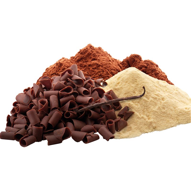 Melkpoeder, suiker, gemodificeerd zetmeel (gemodificeerd maiszetmeel), cacao (14%), 8% chocolade (cacao 46%), suiker, cacaoboter (5%), boterolie, voedingszuur (E322), natuurlijk vanille (0,40%)).