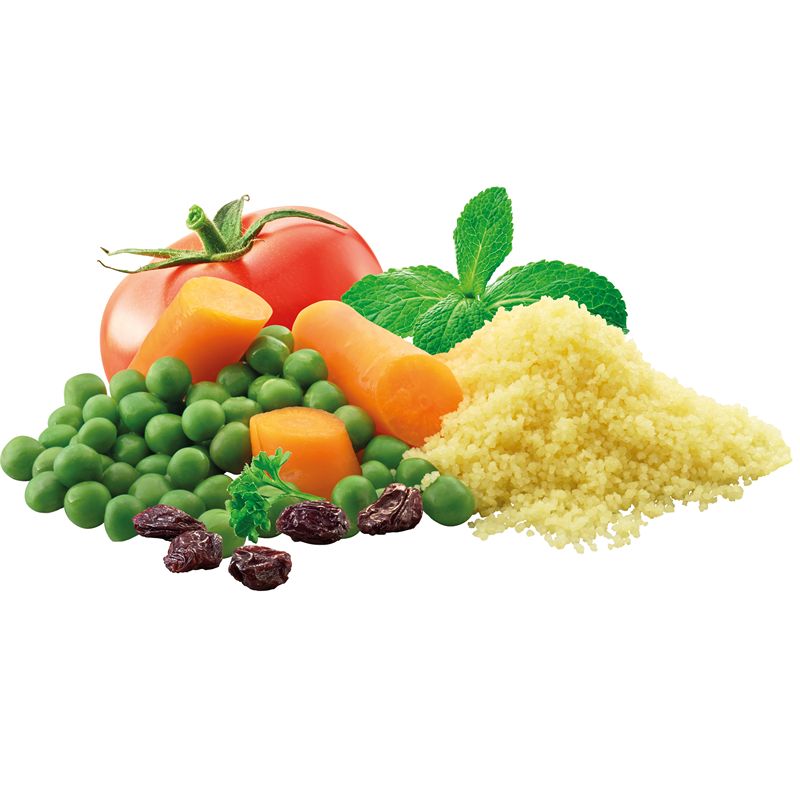 Couscous (61%), zonnebloemolie, rozijnen (6%), paprika, doperwten (4%), tomaat (4%), ui, glucosestroop, gehydrolyseerd eiwit (mais, raapzaad), wortel (2%), gemodificeerd zetmeel (gemodificeerd maiszetmeel), peterselie (0.31%), munt (0.31%), knoflook, natuurlijk aroma, peper, citroenaroma (maltodextrine, aroma)