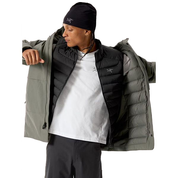 Minimalistisch design met maximale bescherming tegen weersinvloeden.De Therme Down Parka combineert stijl met de technische eigenschappen van een beproefde Arc'teryx hardshell. De warm gevoerde jas is gemaakt voor wandelingen en uitstapjes in de stad bij nat en koud weer. Het GORE-TEX ePE-materiaal beschermt tegen neerslag en wind. De verstelbare capuchon (StormHood™) biedt extra bescherming tegen wind en stortbuien. Dankzij het lichtgewicht ganzendons wordt de warmte vastgehouden. Het membraan is vernieuwd. Het GORE-TEX ePE-materiaal bevat geen opzettelijk toegevoegde PFAS. Ook de buitenstof is anders en heeft een canvasachtige structuur. Verder is er synthetische Coreloft™-isolatie aangebracht in de capuchon en op vochtgevoelige delen zodat de jas warm blijft als het nat is. De donskamers zijn naar binnen gericht zodat aan de buitenzijde van de jas geen banen zichtbaar zijn. De mouwen hebben aan de binnenzijde manchetten om de warmte vast te houden. De extra grote buitenzakken bieden veel opbergruimte.Een tweerichtingsrits aan de voorkant zorgt voor ventilatie en bewegingsvrijheid.