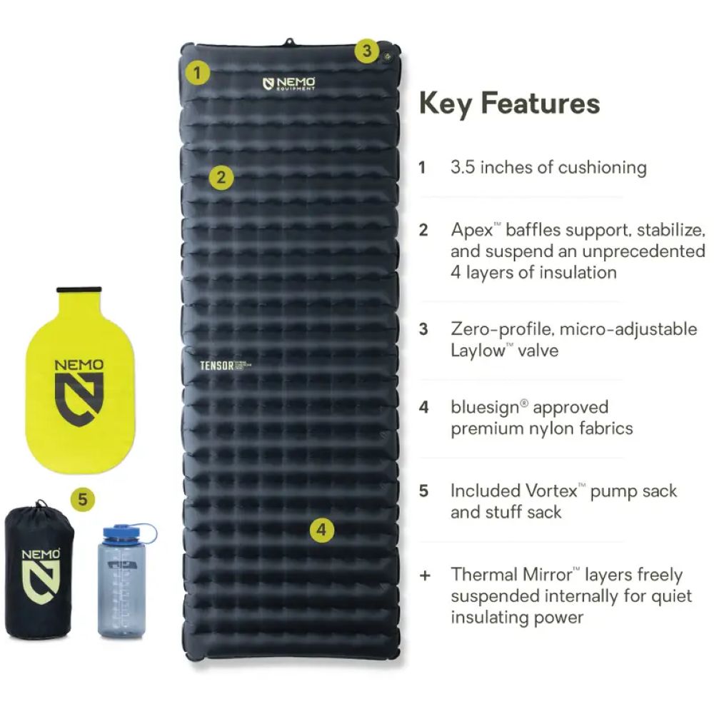 De Tensor™ Extreme Conditions mat van Nemo is nieuw. Deze innovatieve mat heeft een Apex™ banen structuur met een R-waarde van 8,5 en een verbluffende warmte-gewichtsverhouding. Met behulp van schotten van het Apex™ systeem worden vier lagen isolerende Thermal Mirror-folie™ opgehangen in de mat. De strategische plaatsing en het aantal lagen zorgen samen voor ongelooflijk veel warmte terwijl de mat licht van gewicht is. Net zo belangrijk is dat de zwevende constructie vervelende kreukelgeluiden voorkomt. Verder heeft de Tensor Extreme Conditions een goede lekbestendigheid en sterkte door de 40D nylon onderkant waardoor de mat beschermd is tegen ruwe ondergrond. De bovenkant is gemaakt van 20D nylon en voelt zacht aan. Het Laylow-ventiel™ van de mat is gebruiksvriendelijk onder alle omstandigheden, vooral bij koudere temperaturen. Bovendien kan de mat nog steeds moeiteloos worden gecombineerd met onze Vortex-pompzak™ en is slechts binnen enkele minuten opgeblazen.